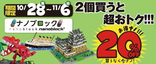 トイザらスでは、10月28日(金)~11月6日(日)の期間中、対象のNanoblock & Nanoblock Plus を2個買うと20%OFF(2個毎の割引となり、価格の安い商品からの割引となります)キャンペーンを実施中です。 11月6日(日)まで!ナノブロック2個買うと超おトク!…